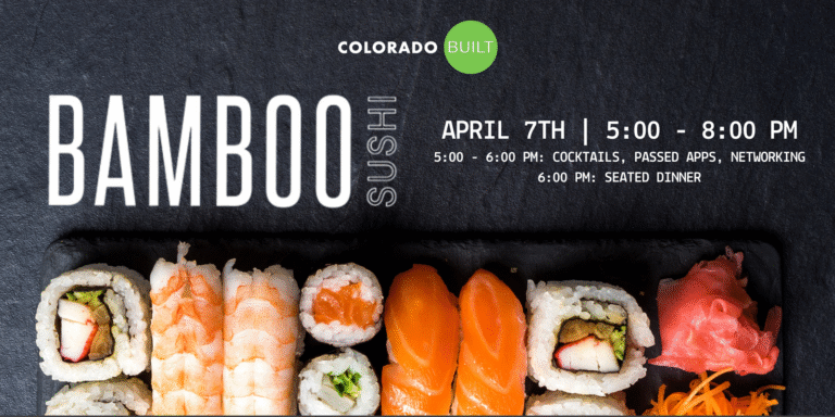 Join us for the annual CO BUILT Sushi Dinner at Bambook Sushi on April 7th from 5 PM – 8 PM! Cocktails, Passed Apps, Networking from 5 PM – 6 PM, with seated dinner starting at 6 PM. We have a full venue buyout!